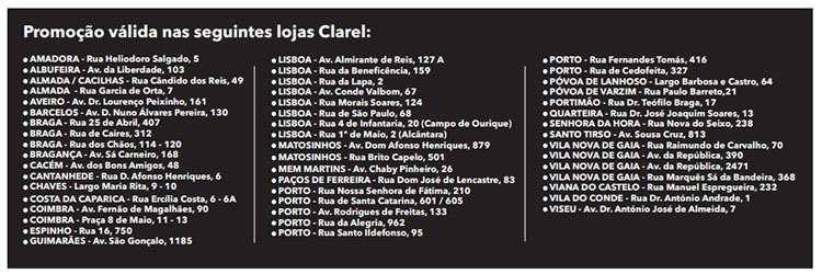 Lojas ClarelActualmente existem cerca de 50 lojas Clarel de Norte a Sul de Portugal e para saber tem alguma perto de si, pode consultar o site oficial da cadeia aqui ou ver a imagem que anexamos onde estão mencionadas muitas delas, nomeadamente aquelas em que esta oferta de que hoje falamos é válida.