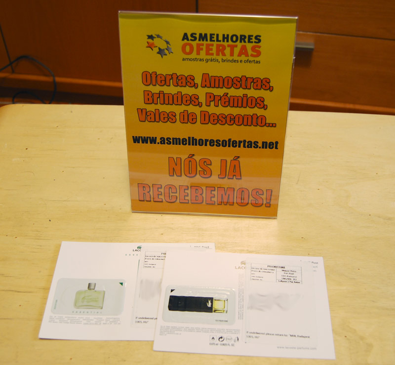 Já cá estão!!! Demoraram bem pouco, quando comparadas com outros pedidos e outras marcas. Estamos, é claro, a falar das amostras gratuitas de perfumes Lacoste.